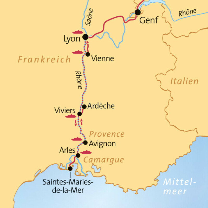 Anreise über München nach Lyon. Dort erwartet Sie bereits das A-ROSA-Schiff zum Check-In. Nach dem Abendessen heißt es „Leinen los“ zu einer unvergesslichen Kreuzfahrt auf der Rhône durch die traumhaften Landschaften Frankreichs.