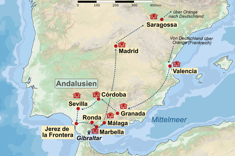 Sie wohnen in ausgewählten Hotels der guten bis sehr guten Mittelklasse: Orange: (1 ÜN) **** Hotel MERCURE Orange, ca. 2 km vom römischen Theater entfernt, Valencia: (1 ÜN) **** Hotel EXE Rey Don Jaime, gegenüber der schönen Gärten am Rio Turia, 15 Gehminuten zum Stadtzentrum, Dachterrasse mit Pool, Granada: (1 ÜN) **** Hotel MELIÁ Granada, im Stadtzentrum, mit Ausblick auf die Alhambra, Cordoba: (1 ÜN) **** Hotel HESPERIA Cordoba, modernes Haus in der Nähe des Stadtzentrums mit Blick auf die Mezquita, Sevilla: (2 ÜN) **** Hotel Becquer, im Herzen der Altstadt, mit Dachpool und Panoramablick über die Stadt, Raum Marbella/Estepona: (2 ÜN) 5 Sterne Hotel SENATOR Banus, 500 m zum Strand, ruhig gelegen, alle Zimmer mit Terrasse und Gartenblick, 12 km zum Stadtzentrum Marbellas, Abendessen in einem örtlichen Restaurant, Madrid: (1 ÜN) **** Hotel SERCOTEL GH Conde Duque, elegantes Haus im Herzen der Stadt, Saragossa: (1 ÜN) **** Hotel EXE Boston, zentrale Lage, 20 Gehminuten in die Altstadt, Orange: (1 ÜN) **** Hotel MERCURE Orange, s.o.