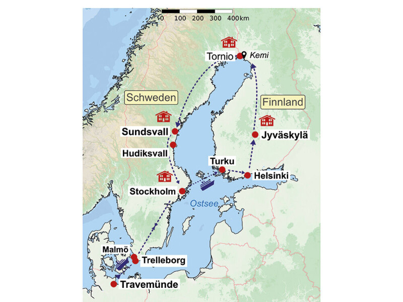 Jyväskylä: (1 ÜN) **** Hotel SCANDIC Jyväskylä Station, im Stadtzentrum, mit Sauna und Innenpool, Tornio: (2 ÜN) **** Park Hotel, zentral gelegen, nur wenige Minuten vom Einkaufszentrum Rajalla, Wellnessbereich mit Saunen, Innenpool und Fitnessraum, Sundsvall: (1 ÜN) **** Hotel SCANDIC Sundsvall City, im Zentrum, in unmittelbarer Nähe zur beliebten Einkaufsstraße, Stockholm: (1 ÜN) **** Hotel SCANDIC Park, im Stadtzentrum mit Blick auf den Humlegården Park. Die Fährüberfahrten Travemünde - Trelleborg (1 ÜN), Stockholm - Turku (1 ÜN) und Malmö - Travemünde (1 ÜN) erfolgen in 2-Bettkabinen innen mit DU/WC an Bord der Fähren der TT Linie bzw. Viking oder Tallink Silja Linie