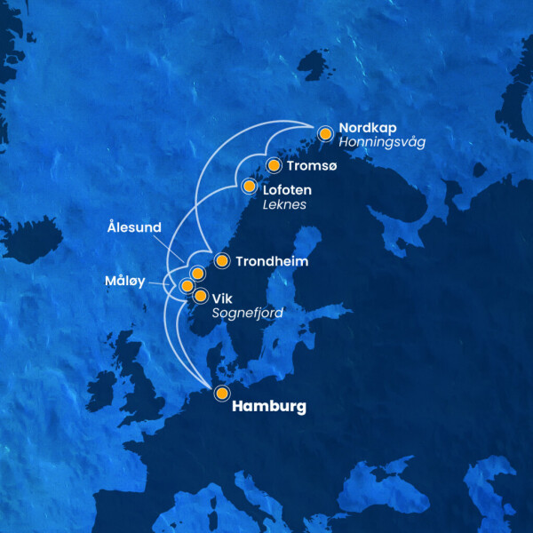 Tag Hafen / Land Ankunft Abfahrt 1./2. Tag Nachtanreise nach Hamburg - 20:00 Uhr 3. Tag Erholung auf See - - 4. Tag Måløy (Norwegen) 13:30 Uhr 20:00 Uhr 5. Tag Erholung auf See - - 6. Tag Leknes (Norwegen) 08:00 Uhr 18:00 Uhr 7. Tag Tromsø (Norwegen) 09:00 Uhr 18:00 Uhr 8. Tag Nordkap/Honningsvåg (Norwegen) 08:00 Uhr 18:00 Uhr 9. Tag Erholung auf See - - 10. Tag Trondheim (Norwegen) 12:00 Uhr 20:00 Uhr 11. Tag Ålesund (Norwegen) 08:00 Uhr 18:00 Uhr 12. Tag Vik/Sognefjord (Norwegen) 09:00 Uhr 17:00 Uhr 13. Tag Erholung auf See - - 14. Tag Hamburg (Deutschland) 08:00 Uhr -