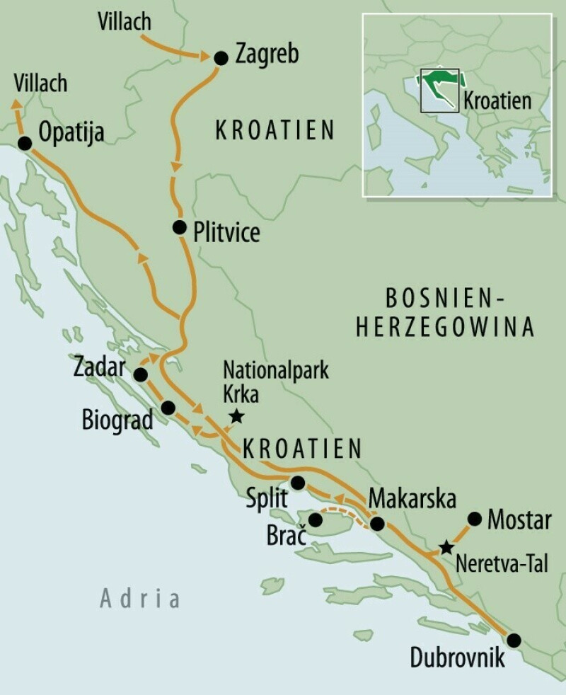 „Als Gott sein Werk krönen wollte, schuf er am letzten Tag aus Tränen, Sternen und dem Hauch des Meeres die Kornati“ schrieb George Bernard Shaw über die Inselkette Dalmatiens mit ihren 147 Inseln und Klippen. Die Makaraska Riviera in Dalmatien zählt zu den schönsten Küsten im Mittelmeerraum. Traumhafte Strände, Buchten und Inseln werden Sie ebenso begeistern wie die historisch interessanten Städte Dubrovnik, Split, Zadar und Mostar. Erleben Sie auch die Faszination der kroatischen Nationalparks Krka und Plitwitzer Seen mit Drehorten der „Winnetou“ Verfilmungen.
