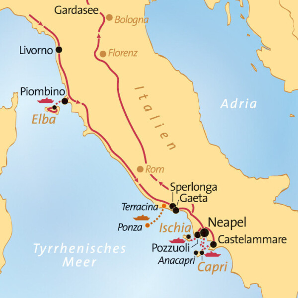Heute unternehmen Sie einen Ausflug zur Insel Elba. Mit dem Bus erreichen Sie den Hafen von Piombino und von dort Fährüberfahrt auf die Insel Elba. Bei der Rundfahrt über die Insel zeigt Ihnen Ihr Reiseleiter die üppige Vegetation und Sie sehen die herrlichen Orte und Badestrände. Unterwegs haben Sie Zeit für einen kleinen Stadtbummel in Porto Azzurro und im Ort Marina di Campo. Rückfahrt mit der Fähre zum Festland und mit dem Bus zurück zum Hotel in der Toskana.