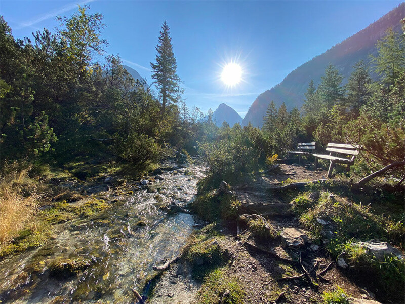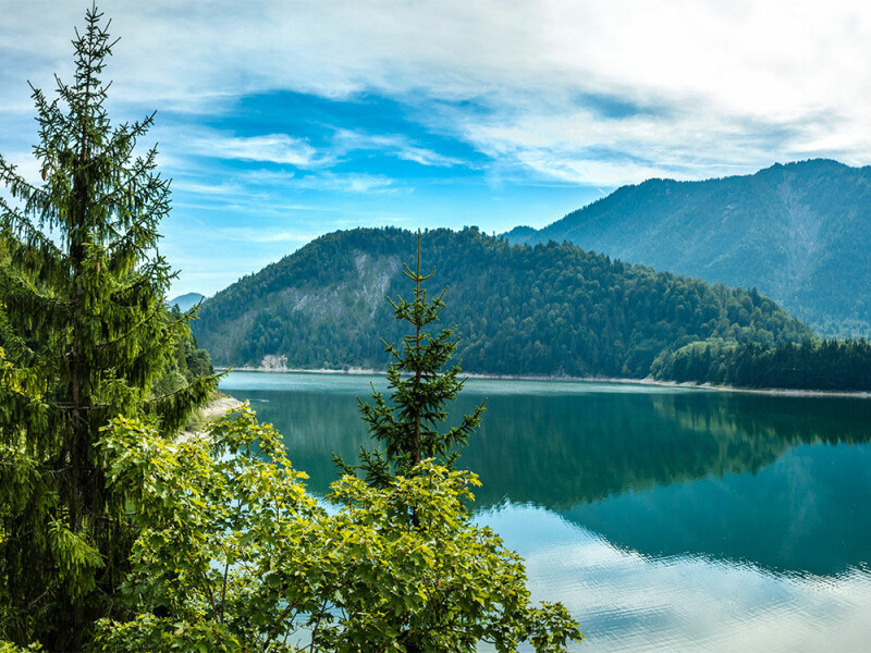 Abfahrt mit dem Bus nach Scharnitz. Ab hier radeln wir zum Isarursprung. 500 m zu Fuß zur Quelle. Talfahrt nach Mittenwald. Aufenthalt. Vorbei an der Karwendel- und Edelweißkaserne und über Krün - Wallgau - an den Sylvensteinstausee zum Jäger von Fall mit herrlichem Biergarten. Gelegenheit zum Abendessen.