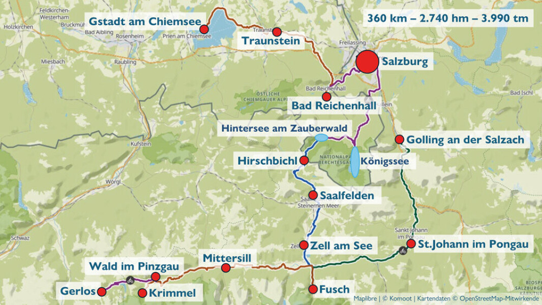 Genussradeln über Hochfilzen - Krimml - Tauernradweg - Zell am See - Saalachtal - Hintersee - Zauberwald - Königssee - Berchtesgaden - Salzburg - Bad Reichenhall - Traunstein - Chiemsee