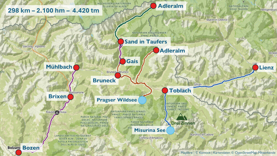 Der Bus bring uns zum Misurinasee auf 1.756 m, unterhalb der drei Zinnen. Wir radeln talwärts mit imposantem Ausblick auf die Bergkulisse der Sextener Dolomiten und erreichen nach ca. 8 km / 350 tm den Dolomiten-Radweg, die Trasse der ehemaligen Schmalspurbahn. Dieser folgen wir bis Toblach. Dem Drauradweg folgend, entlang über Almwiesen und durch herrliche Wälder gelangen wir in die malerische Osttiroler Landeshauptstadt Lienz. Aufenthalt. Mit dem Bus zurück.