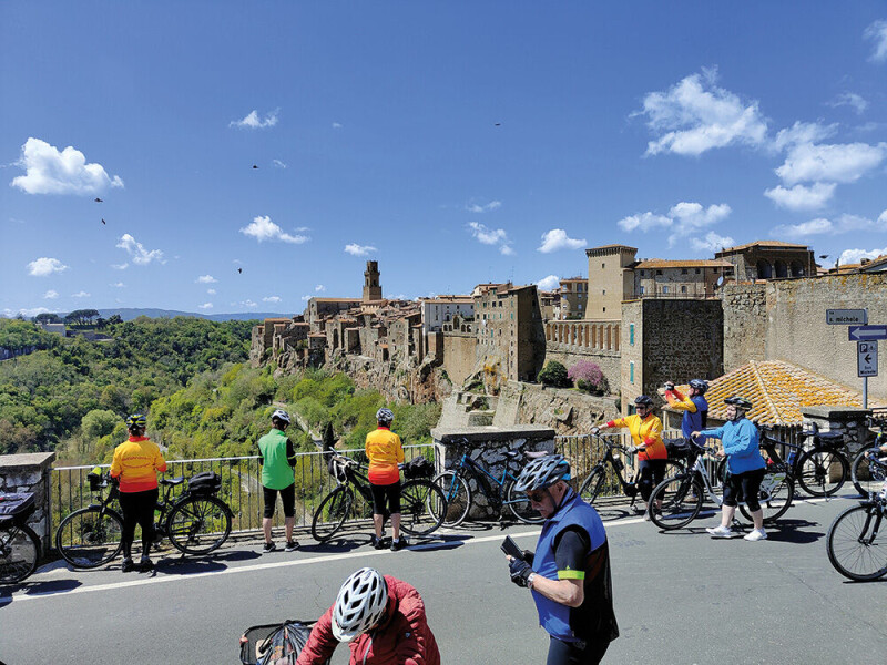 Wir starten unweit von San Quirico und durchqueren Nussplantagen und halten am Belvedere von Sorano, dem unberührtesten Ort der Tuscia. Nach dem Fotostopp radeln wir weiter nach Pitigliano, dass auch Klein Jerusalem genannt wird. Der Ort liegt einzigartig und malerisch auf einem Felsen. Nach einem Spaziergang durch den Ort erfolgt die verdiente Mittagspause. Anschließend radeln wir zu einer der beeindruckenden Etruskerstraßen, die dort vor 2500 Jahren in den Tuff gehauen worden sind. Weiter radeln wir ins geheimnisvolle Sovana, die einstige Hauptstadt der Maremma. Heute zeigt sich der Ort klein und entspannt mit wunderbaren Sehenswürdigkeiten. Durch den Canyon von Sorano radeln wir in den Ort zurück, erkunden ihn und beenden unsere Tour wieder bei San Quirico.