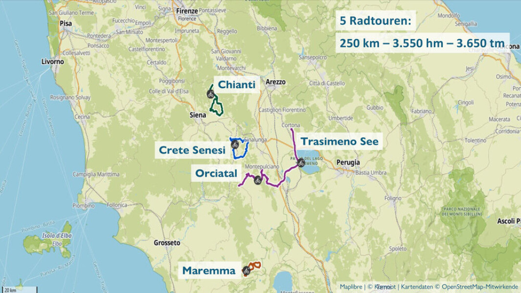 Traumtouren, wo die Landschaft besonders toskanisch ist. Ob man im Orciatal radelt, das immerhin 2004 von der UNESCO zur Weltkulturlandschaft erklärt worden ist. Ob man durch das Chianti fährt, das in aller Munde ist oder auf den Spuren der Etrusker. Das Ergebnis sind immer landschaftlich einmalige Touren.