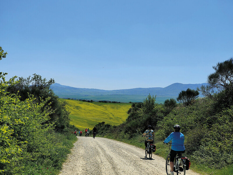Die weite Landschaft der Crete Senesi ist ein Highlight für alle Radfahrer. Auf einer Höhenstraße radeln wir an Montisi vorbei nach San Giovanni d’Asso. Wer Lust hat, macht vor der verdienten Kaffeepause einen Abstecher in den Garten Bosco della Ragnaia. Wir genießen den Blick auf die eleganten Hügel und das Kloster Monte Oliveto Maggiore, das in beeindruckender Einsamkeit liegt. Weiter geht es ins Tal nach Asciano, dem Hauptort der Crete. Die Tour endet mit schönem Ausblick in dem mittelalterlichen Ort Trequanda, wo wir die Räder wieder verladen.