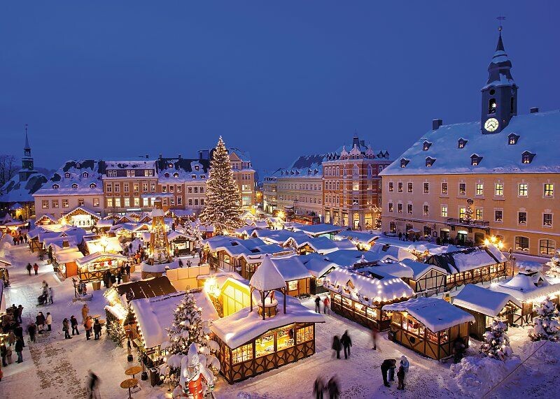 Das Erzgebirge ist unter anderem für die traditionelle Handwerkskunst bekannt, welche Sie überall auf den Weihnachtsmärkten entdecken können. Nicht weit entfernt besuchen Sie die tschechischen Kurorte Karlsbad und Marienbad - bummeln Sie entlang der festlich geschmückten Kollonaden.