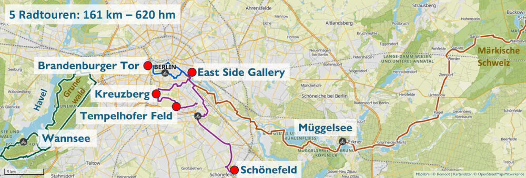 Wir radeln ab Hotel entlang dem Müggelsee und Möllensee in die Märkische Schweiz. Dort holt uns der Bus wieder ab.