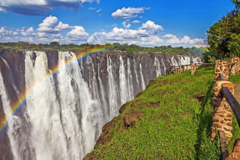 Weiterfahrt nach Victoria Falls. Nach einer Erfrischung im Hotel sind Sie bereit für den Besuch der Victoriafälle – ein wahrhaft „berauschendes Erlebnis“. Der Sambesi stürzt sich auf einer Breite von fast 1.700 Metern bis zu 108 Meter tief in eine nur etwa 50 Meter breite Schlucht. In der Regenzeit fließen hier rund 10.000.000 Liter Wasser pro Sekunde über den Felsrand. Der entstehende Sprühnebel der Wasserfälle kann bis zu 400 Meter in die Höhe steigen. Die Einheimischen nennen die Fälle deshalb „Mosi-oa-Tunya“, was so viel wie „Rauch, der donnert“ bedeutet. Auf einer Wanderung entlang der Fälle erleben Sie spektakuläre Ausblicke. Als erstes besuchen Sie den „Big Tree“, einen über 1000 Jahre alten Baobab-Baum mit einem Durchmesser von über 16 Metern. Dann führt Ihr Weg durch dichten Regenwald zum Devil’s Cataract – das donnernde Tosen der Wassermassen ist schon von weitem zu hören. Ihre Wanderung führt entlang verschiedener Aussichtspunkte, wobei die Aussicht immer eindrucksvoller wird. An den Main Falls fällt das Wasser in einem breiten Schleier über den Rand der Schlucht, ein Anblick, der Sie in seiner faszinierenden Schönheit gefangen nimmt. Beim gemeinsamen Abendessen im Restaurant lassen Sie die Namibia, Botswana und Zimbabwe Reise ausklingen.