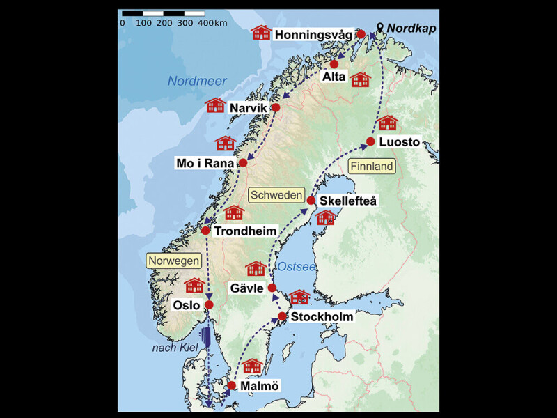 Malmö (1 ÜN) **** SCANDIC St. Jörgen, modernes Hotel im Stadtzentrum, Stockholm: (1 ÜN) ****SCANDIC Södra Kajen im Hafen des Stadtteils Värtan mit Panoramabar, Gävle: (1 ÜN) **** SCANDIC CH Gävle, zentral gelegenes, gutes Mittelklassehotel, Skellefteå: (1 ÜN) **** The Wood by ELITE, im Stadtzentrum mit Bergblick, Luosto: (1 ÜN) **** LAPLAND HOTELS Luostotunturi, moderne Hotelanlage am Fuße des gleichnamigen Fjells in Finnisch-Lappland, Honningsvåg: (1 ÜN) *** SCANDIC Honningsvåg, am Hafen oder *** SCANDIC Nordkapp, idyllisch gelegen, Alta: (1 ÜN) **** SCANDIC Alta, im Zentrum der Stadt, Narvik: (1 ÜN) **** SCANDIC Narvik, in zentraler Lage, Sky Bar mit Blick auf den Ofotfjord, Mo i Rana: (1 ÜN) **** SCANDIC Meyergarden, im Stadtzentrum in einem Gebäude aus dem 19. Jahrhundert, Trondheim: (1 ÜN) **** SCANDIC Lerkendal Trondheim, modernes, umweltfreundliches Hotel, nur wenige Fahrminuten vom Stadtzentrum entfernt, Oslo: (1 ÜN) ****SCANDIC St. Olavs Plass, fußläufig zur Einkaufsstraße Karl Johans Gate gelegen.