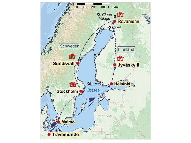 Jyväskylä: (1 ÜN) **** Hotel ORIGINAL SOKOS Alexandra Jyväskylä, im Stadtzentrum mit Sauna und Whirlpool, Rovaniemi: (3 ÜN) **** Hotel ORIGINAL SOKOS Vaakuna Rovaniemi, zentral gelegen in der Nähe der Einkaufsstraße, Sundsvall: (1 ÜN) **** Hotel SCANDIC Sundsvall City, im Zentrum, in unmittelbarer Nähe zur beliebten Einkaufsstraße, Stockholm: (1 ÜN) **** Hotel SCANDIC Park, im Stadtzentrum mit Blick auf den Humlegården Park. Die Fährüberfahrten Travemünde - Helsinki (2 ÜN) und Malmö - Travemünde (1 ÜN) erfolgen in 2-Bettkabinen innen mit DU/WC an Bord der Fähren der Finnlines.