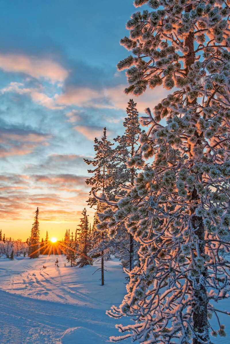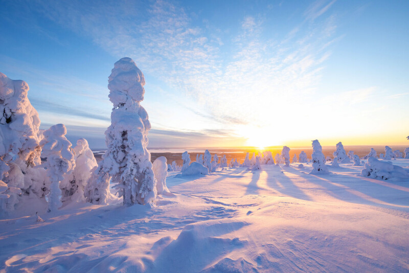 - Snowy-Landschaft bei Sonnenuntergang, gefrorene Bäume im Winter in Saariselka, Lappland, Finnland © Delphotostock - stock.adobe.com