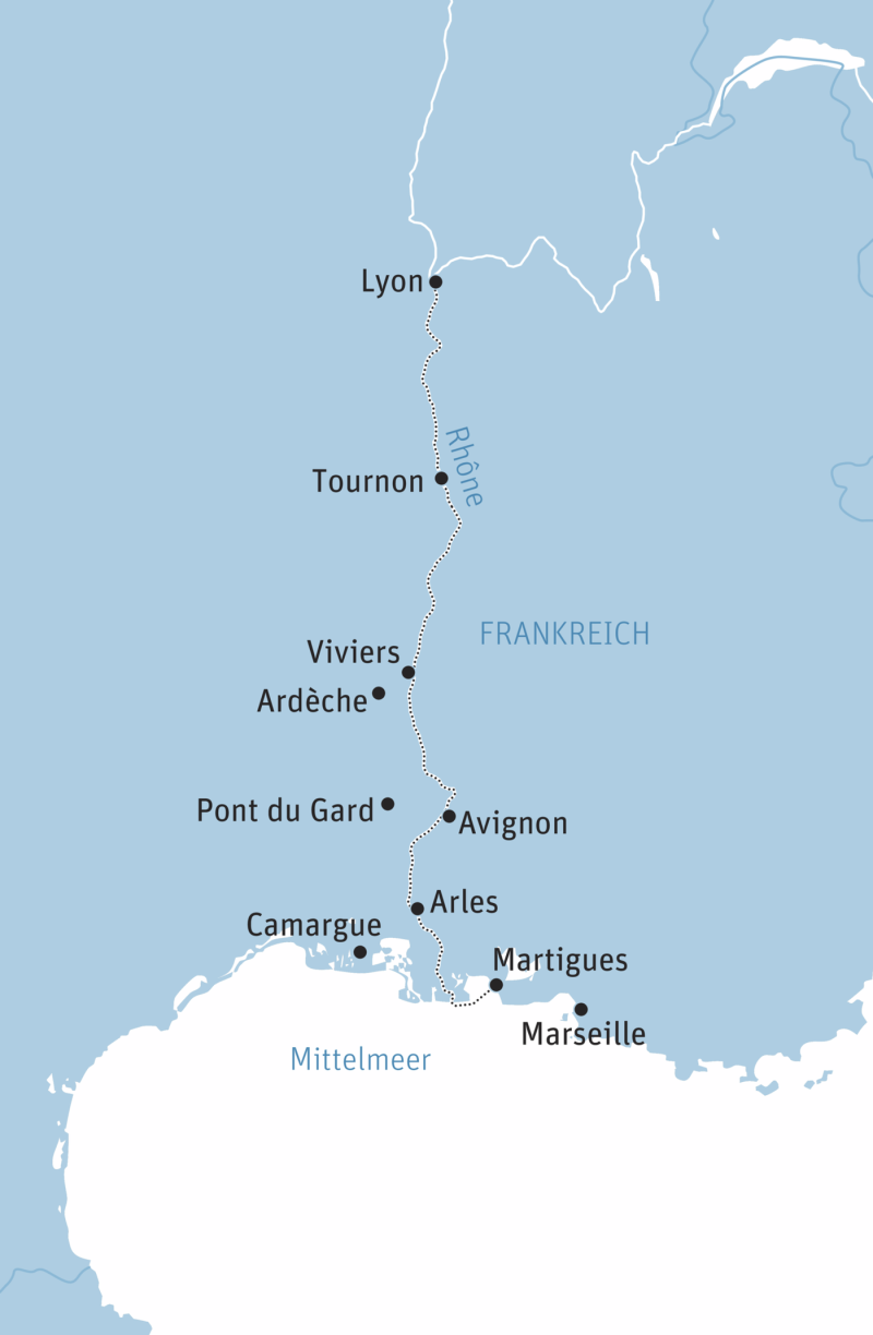 8-tägige Flusskreuzfahrt in Frankreich auf der Rhône ab/bis Lyon an Bord der MS Voyage inklusive Busan-/abreise, Vollpension, Stadtführung mit Reiseleitung in Arles, Martigues und Avignon sowie Aufenthalt in Tournon, Viviers und Lyon mit optionalem Ausflugspaket, u.a. mit einem Busausflug in das Naturschutzgebiet Camargue, nach Marseille sowie in die berühmte Ardèche.