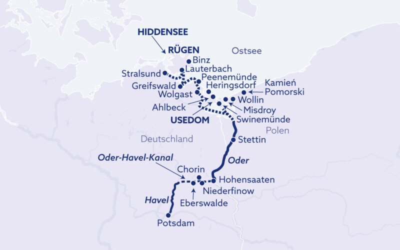 Diese Flusskreuzfahrt zwischen der Hansestadt Stralsund und Potsdam, vorbei an den deutschen Ostseeinseln, verspricht jeden Tag kontrastreiche Erlebnisse. Staunen Sie über das Schiffshebewerk in Niederfinow und genießen Sie im Nationalpark Unteres Odertal die herrliche Natur. Nach dem Besuch unserer polnischen Nachbarn in Stettin wird unsere Flusskreuzfahrt zur „Seefahrt“. An der Ostseeküste entlang geht es zu den Inseln Usedom, Rügen und dem kleinen Hiddensee. Genießen Sie die herrlichen Landschaften mit der berühmten Bäderarchitektur.