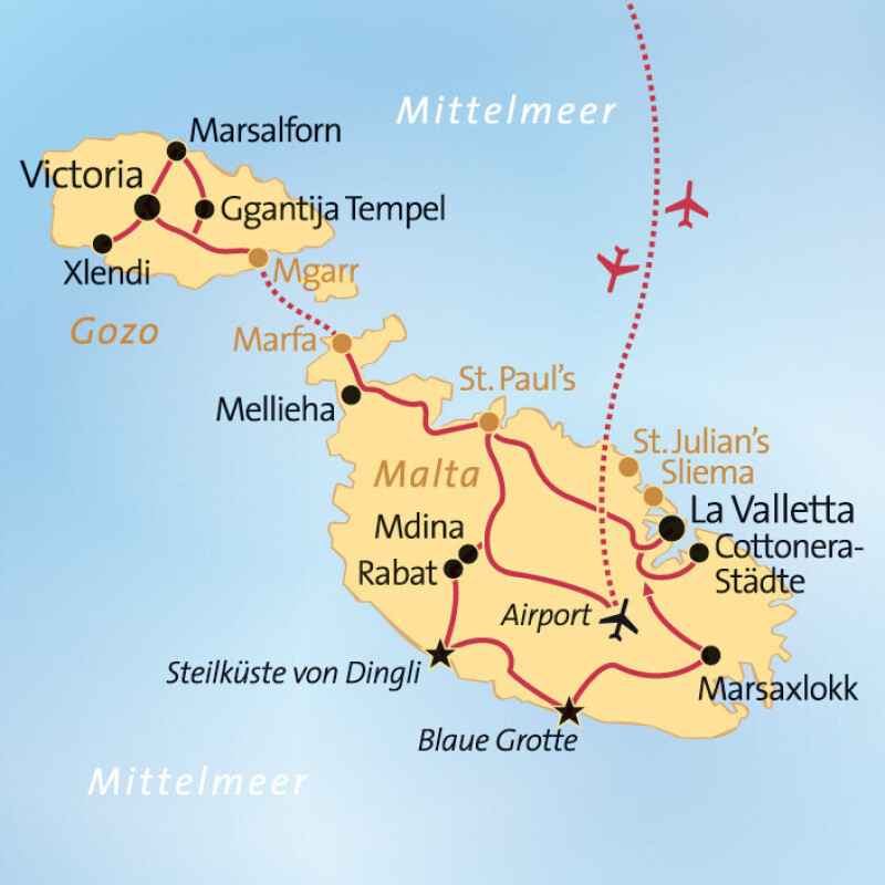 Heute geht es in die „schweigende Stadt“ Mdina. Die von Befestigungsmauern umgebene Stadt war und ist Sitz des maltesischen Adels. Nach der Besichtigung der St. Paul’s Kathedrale Weiterfahrt in das nahe gelegene lebhafte Rabat, wo Sie die St. Paul’s Katakomben, eine der größten unterirdischen Begräbnisstätten der Insel, mit einem weit verzweigten Gangsystem erleben. Sie sehen u.a. einen großen Sakralraum mit einer tiefer gelegenen Kapelle. Nach einer Panoramafahrt durch die Buskett Gardens zur wildromantischen Steilküste von Dingli besuchen Sie die Blaue Grotte, welche ausschließlich per Boot erreichbar ist. Nächstes Ziel ist das malerische Fischerdorf Marsaxlokk mit seinen bunten Fischerbooten, den Luzzu. Ein kleiner Markt dort bietet regionale Produkte an, und zum Abschluss können Sie sich auf einen anregenden Spaziergang durch die botanischen Gärten von San Anton begeben, bevor Sie zu Ihrem Hotel zurückkehren.