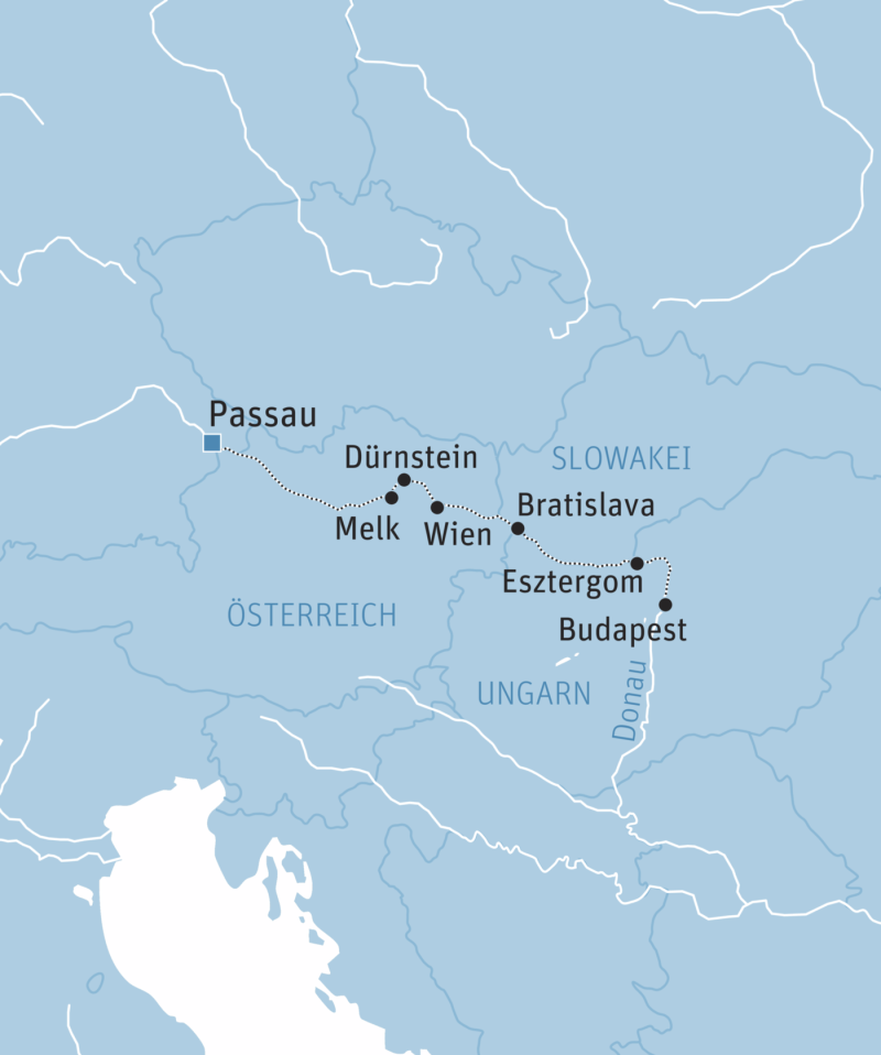 8-tägige Flusskreuzfahrt auf der Donau ab/bis Passau an Bord der MS Swiss Crown inklusive Busan-/abreise, Vollpension, Stadtrundfahrt/-gang mit Reiseleitung in Wien, Budapest und Bratislava, sowie Aufenthalt in Dürnstein, Esztergom und Melk mit optionalen Ausflugsmöglichkeiten.