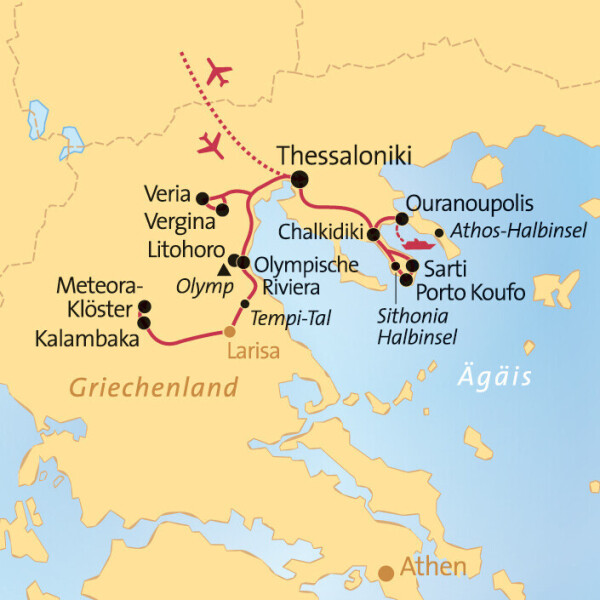Flug von München nach Thessaloniki. Dort erwartet Sie bereits der Marx-Reisebus. Gemeinsam fahren Sie zum Strandhotel in Piera an der Olympischen Riviera, in dem Sie drei Nächte bleiben werden. Abendessen und Übernachtung.