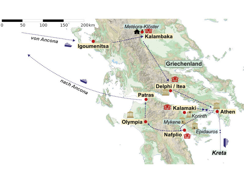 Griechenland im Frühjahr - was kann es Schöneres geben? Entdecken Sie faszinierende Landschaften, Berge und Dörfer, Strände und Hafenstädte im strahlenden Licht der Ägäis. Tauchen Sie in die Wiege der abendländischen Kulturgeschichte ein und besuchen Sie die bedeutendsten Stätten der klassischen Antike. Es erwarten Sie unvergessliche Eindrücke auf einer außergewöhnlichen Reiseroute! Die Fahrt führt Sie zu den berühmten Meteora-Klöstern, zur Hauptstadt Athen, auf die Insel Kreta und über die landschaftlich sehr reizvolle Peloponnes. Ausflüge in die Antike erleben Sie in Delphi, Alt-Korinth, Mykene, Epidauros und Olympia. Die Reiseleitung wird Sie ab Hafen Igoumenitsa bis Hafen Patras begleiten und Ihnen die Sehenswürdigkeiten ihres Heimatlandes zeigen.