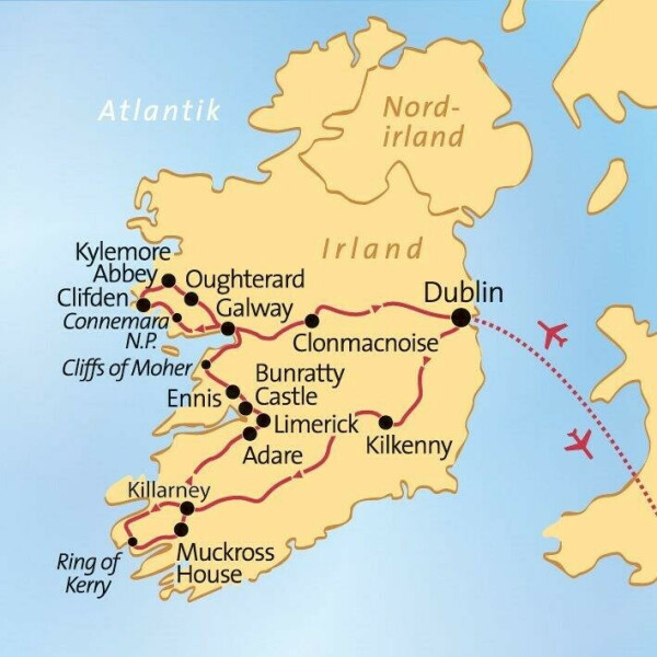 Über das Kalksteinplateau im Nordwesten von Clare, dem sogenannten Burren fahren Sie zu den atemberaubenden Cliffs of Moher. Über Ennis fahren Sie weiter in Richtung Limerick, wo Sie Bunratty Castle einen Besuch abstatten und den Bunratty Folkpark sehen. Hier zeigen Iren in traditioneller Kleidung alte Handwerksarbeiten, wie u.a. Weben und Buttern. Südlich von Limerick liegt Adare, das hübscheste Dorf Irlands. Die vielen herausgeputzten, reetgedeckten Cottages verleihen dem Ort sein einzigartiges Flair. Weiterfahrt nach Killarney zum Hotel, in dem Sie zwei Nächte bleiben werden.