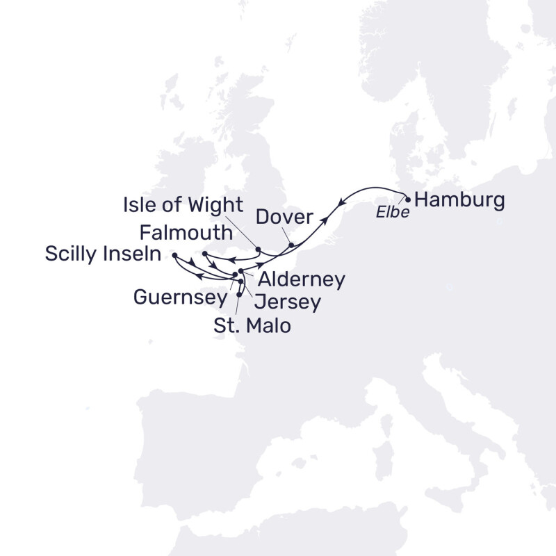 Auf dieser Reise wetteifern England und Frankreich um Ihre Gunst. England macht den Anfang: Bewundern Sie die schroffe Küste der Isle of Wight und die sanfte Landschaft von Cornwall, spazieren Sie durch das kleine Hugh Town auf den Scilly Inseln oder auf Guernsey zum großen Castle Coronet. Auf Jersey blicken Sie von Burg Mont Orguiel auf den schmucken Hafen, auf Alderney von den steilen Klippen über den schimmernden Ärmelkanal. Frankreich schickt das malerische St. Malo, den imposanten Mont Saint Michel und die türkisgrüne Smaragdküste ins Rennen. Noch kurz einen Abstecher nach Dover oder London wagen, dann nimmt Sie der Hamburger Hafen wieder in Empfang. Welches Land wird Ihr Favorit?