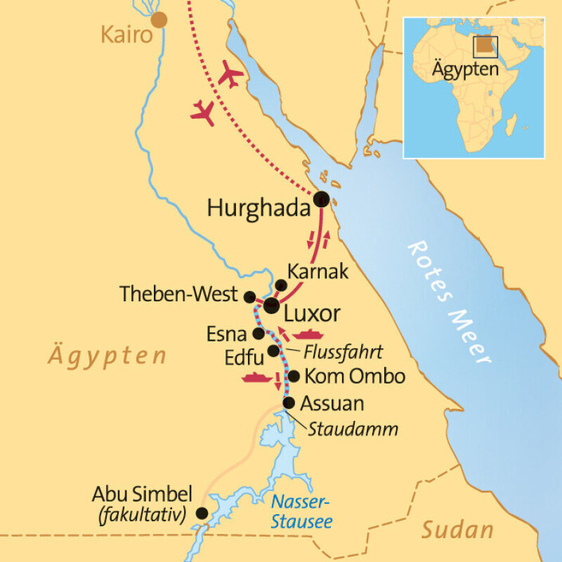Flug von München mit Condor nach Hurghada. Empfang am Flughafen durch Ihre Reiseleitung und Transfer nach Luxor zur Einschiffung.