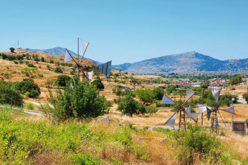 Schroffe graubraune Berge umschließen das fruchtbare Lassithi-Plateau, Kretas größte Hochebene. Über das Dorf Mochos gelangen Sie zum 1841 erbauten Kloster Vidiani. Die Ortschaft Psychro befindet sich am Südrand der Ebene und bietet malerische Ausblicke. Im Dorf Seli Ambelou befindet sich noch ein alter Windmühlenpark.