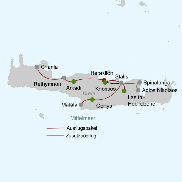 Genießen Sie die Zeit auf Kreta, oder nutzen Sie die Gelegenheit mit dem optionalen Ausflugspaket die schönsten Seiten der Insel zu entdecken