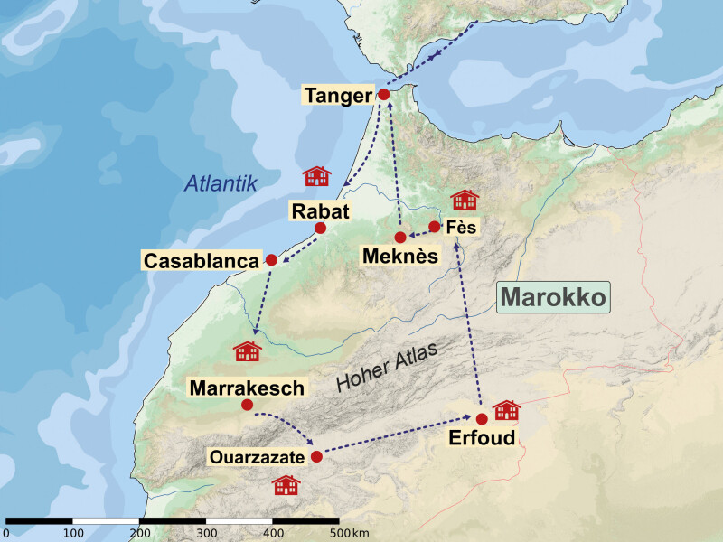 Ihr Reiseziel Marokko ist ein Land mit vielen Gesichtern: Es bezaubert mit einer abwechslungsreichen Landschaft aus endlosen Wüsten, feinen Sandstränden mit azurblauem Meer und den schneebedeckten Gipfeln des Hohen Atlas Gebirges. Ihre örtliche, deutschsprachige Reiseleitung zeigt Ihnen die Höhepunkte dieses faszinierenden Landes. Hier werden die Märchen aus 1001 Nacht lebendig!