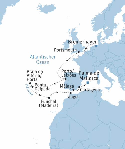 19-tägige Hochseekreuzfahrt von der Nordsee über den Atlantik zu den Azoren und zurück durch das Mittelmeer auf die Balearen an Bord von MS Artania inklusive Vollpension, Busanreise nach Bremerhaven zur Einschiffung, Rückflug ab Palma de Mallorca nach München mit anschließendem Transfer zum Buszustiegsort, Aufenthalt u.a. in Portsmouth, Leixões (Porto), Ponta Delgada Funchal, Tanger, Málaga und Cartagena.