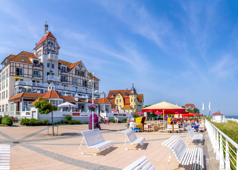 Unternehmen Sie eine Wanderung zum ältesten Seebadeort Deutschlands nach Heiligendamm. Parallel zum Strand, entlang der malerischen Dünen, folgen Sie der Strandpromenade, wo gemütliche Cafés zum Verweilen einladen. Oder Sie fahren mit der Bäderbahn Molli, die älteste Schmalspurbahn an der Küste, in das nahe gelegene Strandbad. In Heiligendamm sollten Sie unbedingt auf der Seebrücke flanieren, die 200 Meter weit in die Ostsee führt. Von dort bietet sich ein fantastischer Blick auf das Meer und auf das Land. Lassen Sie doch von hier die Sonne untergehen und genießen Sie dieses Naturschauspiel mit einem Glas Wein.