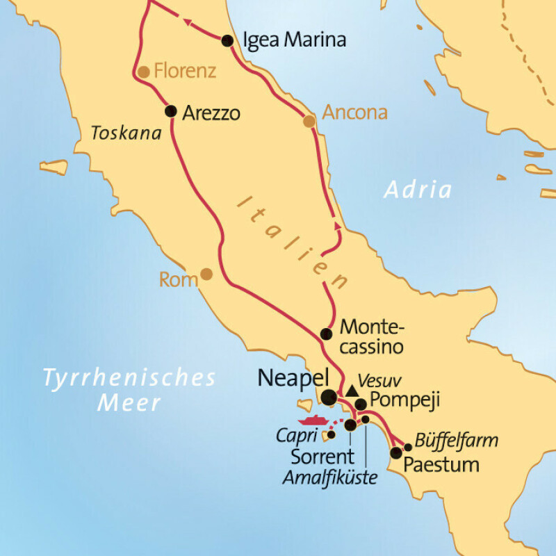 Heute haben Sie die Möglichkeit zum Ausflug auf die Insel Capri. Sie fahren mit einem Shuttlebus zum Hafen. Von dort geht es mit dem Schiff nach Capri. Bei der Rundfahrt mit Minibussen auf der Insel sehen Sie bunt getünchte Häuser, eingebettet in die Felsterrassen und kleine Fischerboote im Hafen. Postkarten-Idylle in jeder Hinsicht und unvergessliche Eindrücke. Rückkehr zum Hotel.