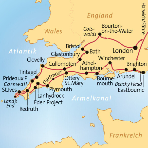Heute wird Sie die Heimat der Rosamunde Pilcher begeistern. Sie fahren nach Land's End mit atemberaubenden Blick auf die Felsen und das Meer. Nach dem Aufenthalt Weiterfahrt nach St. Ives. Das Fischerstädtchen versprüht Pilcher-Charme auf Schritt und Tritt. Erkunden Sie die kleinen Läden und genießen Sie die einmalige Atmosphäre. Anschließend erreichen Sie nach einer kurzen Zugfahrt das idyllische Carbis Bay Hotel. Dort werden Sie zum traditionellen Cream Tea erwartet. Rückfahrt zum Hotel in Redruth.