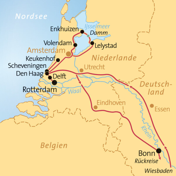 Unterwegs besuchen Sie eine traditionelle Käserei und Holzschuhmacherei. Anschließend geht es über den Deich durch die typische niederländische Polderlandschaft, vorbei an Lelystad und Enkhuizen. Rückfahrt nach Den Haag.