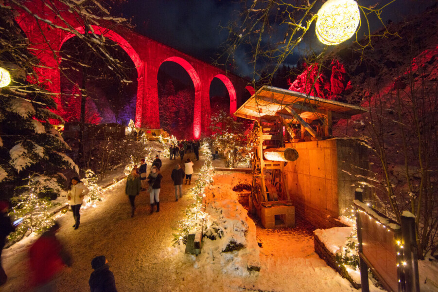 Erleben Sie die schönsten Weihnachtsmärkte in der Region Freiburg, Basel und im Elsass! Ein Highlight ist der romantisch beleuchtete Weihnachtsmarkt in der Ravennaschlucht