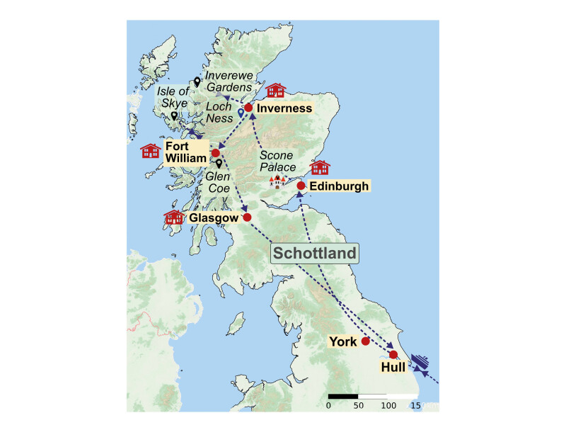 Edinburgh: (1 ÜN) **** VOCO Edinburgh - Royal Terrace, modernes und stilvoll eingerichtetes Hotel mit idyllischem Garten und Terrasse, nur 1,5 km in die Altstadt, Inverness: (2 ÜN) **** BEST WESTERN Palace Hotel & Spa, elegantes Hotel in historischem Gebäude in Zentrumslage mit Blick auf den Fluss Ness und nur 700 m zum Inverness Castle, Fort William: (2 ÜN) *** Hotel im Raum Fort William, Glasgow: (1 ÜN) **** Sandman Signature Hotel, modernes Stadthotel in zentraler Lage, ca. 15 Gehminuten bis ins Zentrum.