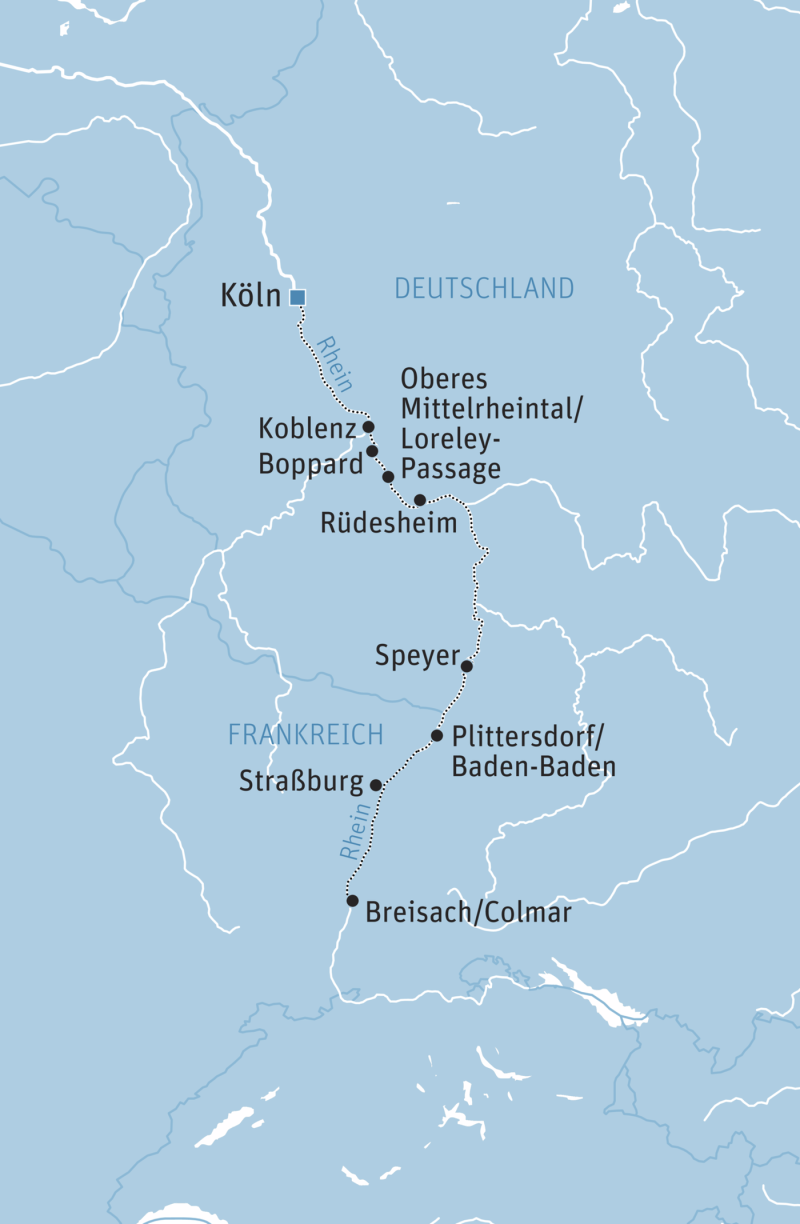 8-tägige Flusskreuzfahrt auf dem Rhein ab/bis Köln an Bord der MS Swiss Crown inklusive Busan-/abreise, Vollpension, Busausflug nach Colmar und Stadtführung in Boppard sowie Aufenthalt in Rüdesheim, Plittersdorf, Breisach, Straßburg, Speyer und Koblenz mit optionalen Ausflugsmöglichkeiten.