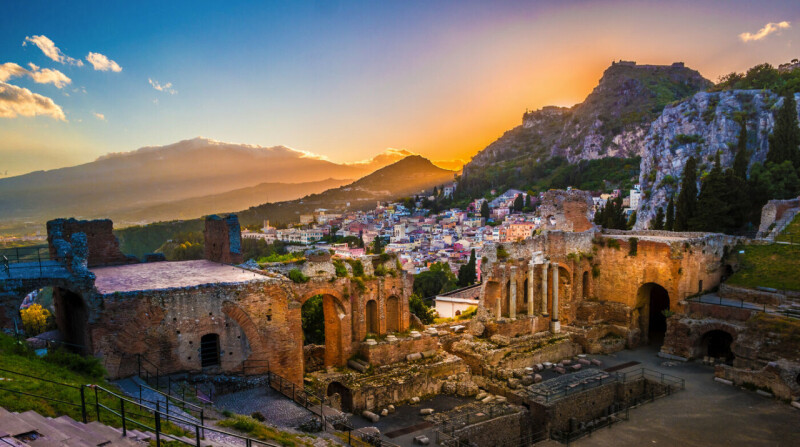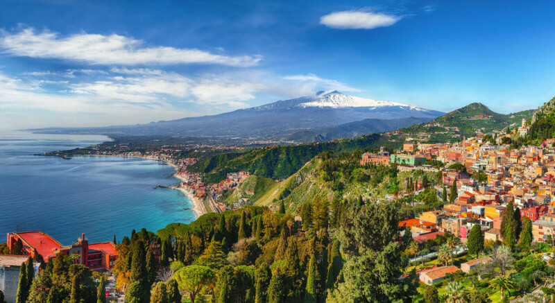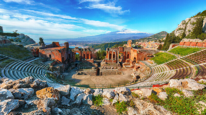 Tag 4: Ätna und Taormina. Ihr Ausflug beginnt mit der Auffahrt auf den Ätna, auf 3340m gelegen, ist es der größte Vulkan Europas. Bei der Auffahrt sehen Sie die verschiedenen Vegetationsstufen. Es werden, je nach Höhenlage, Orangen, Zitronen, Ölbäume und Weinstöcke angebaut. Ab ca. 1300m bis 2100m stehen nur noch Wald und Macchia. Die Gipfelregion ist, bis zum Erreichen der Schneegrenze, eine schwarze, matt glänzende Wüste. Vom Rifugio Sapienza in 1900m Höhe genießen Sie einen eindrucksvollen Blick über Teile der Ostküste Siziliens. Wer möchte, kann mit der Seilbahn und Spezialfahrzeugen (Aufpreis) bis unter den Hauptkrater in 2900m Höhe fahren. Dies ist jedoch abhängig von der Tätigkeit des Vulkans. Am Nachmittag besichtigen Sie Taormina, das malerisch auf einer Terrasse hoch über dem Ionischen Meer liegt. Die charmante Altstadt von Taormina ist geprägt von engen, gepflasterten Gassen, eleganten Boutiquen, einladenden Cafés und exzellenten Restaurants, die die mediterrane Küche Siziliens servieren. Die Corso Umberto, die Hauptstraße der Stadt, lädt zum Flanieren ein. Ein Highlight ist das antike griechisch-römische Theater, das zweitgrößte seiner Art auf Sizilien, von dem aus man eine unvergleichliche Panoramasicht auf die Küste und den Vulkan genießt.