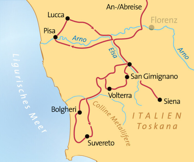 Heute fahren Sie mit dem Bus nach Pisa. Bei einem Stadtrundgang sehen Sie u. a. den schiefen Turm, den Dom und die Taufkapelle. Nach dem Aufenthalt geht die Fahrt weiter nach Lucca, die Stadt der 100 Kirchen. Ihre Reiseleitung zeigt Ihnen beim Stadtrundgang viele interessante Baudenkmäler und die mittelalterlichen Stadtmauern.