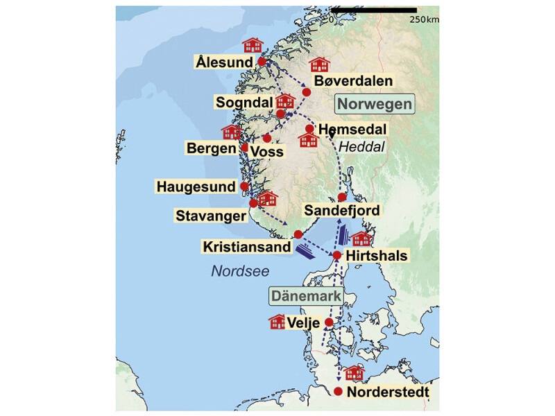 Sie wohnen in ausgewählten Hotels der gehobenen Mittelklasse: Velje (Dänemark): (1 ÜN) **** Hotel BEST WESTERN ToRVhallerne Velje, stilvolles Hotel, Café und Cocktailbar im Innenhof mit Glasdach, Sandefjord: (1 ÜN) **** Home Hotel Atlantic, direkt in Sandefjord, nur wenige Gehminuten zum Hafen, Hemsedal: (1 ÜN) **** Hotel Skarsnuten Mountain Resort & Spa, direkt am Hang, 1000 m über dem Meeresspiegel mit herrlichem Panoramablick, Spa u.a. mit Whirlpools und Sauna, Sogndal: (1 ÜN) **** QUALITY Sogndal, renoviertes Hotel im Ortszentrum, nur 450 m vom Ufer des Sognefjords entfernt, Ålesund: (1 ÜN) **** SCANDIC Parken, mitten im Zentrum neben dem Stadtpark, Bøverdalen: (1 ÜN) **** Hotel Elveseter, familiengeführte Berg-Lodge mit privater Kunstgalerie, Bergen: (1 ÜN) **** Hotel Zander K, modernes Design-Hotel im Stadtzentrum, Stanvanger: (1 ÜN) **** SCANDIC Stavanger City, im Hafenviertel, 10 min. von der Altstadt entfernt, Hirthals (Dänemark): (1 ÜN) **** Montra Skaga Hotel, gute Lage, auf dem Weg zum Fähranleger, Norderstedt: (1 ÜN) **** Hotel BEST WESTERN Schmöker Hof, Deutschlands größtes Solar-Hotel, direkt vor den Toren Hamburgs, mit Sauna und Dampfbad