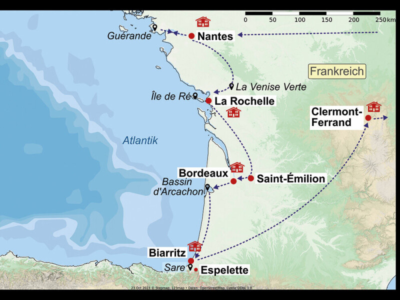 Nantes: (2 ÜN) ****Oceania de France, modernes Hotel in Zentrumslage, La Rochelle: (1 ÜN) ****Hotel BEST WESTERN Premier Masqhotel La Rochelle, 5 Gehminuten zum Alten Hafen, Bordeaux: (1 ÜN)****Hotel MERCURE Bordeaux Centre-Ville, modernes Hotel, 20 Gehminuten von der Altstadt entfernt, Biarritz: (3 ÜN) ****Hotel MERCURE President Biarritz Plage, nur wenige Gehminuten vom Meer entfernt, Clermont-Ferrand: (1 ÜN)****OCEANIA Hotel Clermont-FerrandCentre, ideale Lage im Zentrum.