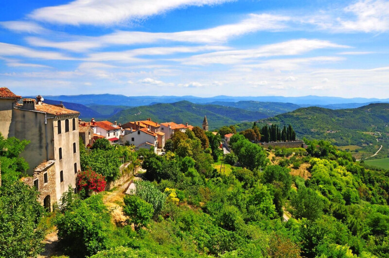 Die istrische Toskana: Nach dem Frühstück fahren wir mit unserem Bus in die „Kroatische Toskana“. Dieser Teil Istriens ist mit der schönste und romantischste überhaupt! Weltberühmte kleine Ortschaften, eine atemberaubende Natur mit großartigen Aussichten und viele, fast autofreie Straßen erwarten uns. Wir starten in Buje, radeln parallel zur berühmten Schmalspureisenbahn Parenzana bis nach Groznjan, dem romantischsten Künstlerort Istriens. Nach einer Kaffeepause geht es weiter auf fast autofreien Straßen in Richtung Oprtalj und weiter nach Motovun. Abendessen und Übernachtung im Hotel.