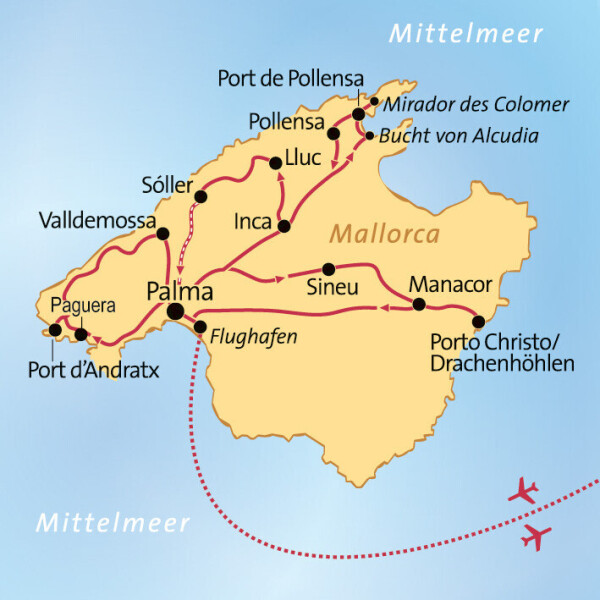 Fahrt zum Flughafen Palma de Mallorca und mittags Rückflug nach München.