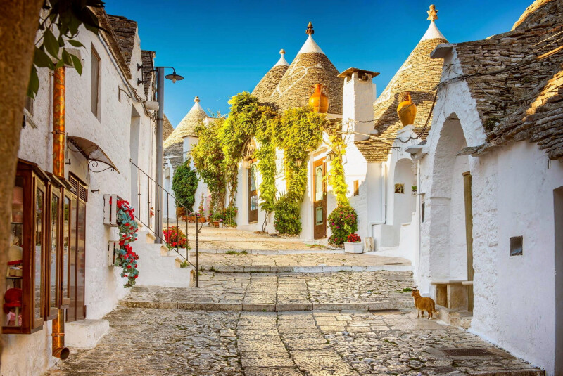Ihr heutiger Ausflug führt Sie nach Alberobello. Die weißen Trulli-Häuschen leuchten schon von Weitem. Diese einzigartigen Kalksteinhäuser mit kegelförmigen Dächern gehören zum UNESCO-Weltkulturerbe. Ihr Reiseleiter enthüllt die Geheimnisse ihrer Entstehung. Anschließend fahren Sie durch eine herrliche Landschaft mit Weinbergen, Olivenbäumen und Zitrusfrüchten über Martina Franca zurück zum Hotel. Unterwegs probieren Sie regionstypischen Wein und Olivenöl.