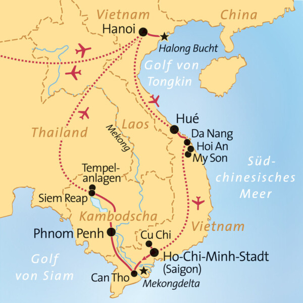 ● 11 Übernachtungen (Bad oder Dusche/WC) in 3- bis 4-Sterne-Hotels (Landeskategorie) inkl. lokale Steuern in Hanoi, Hue, Hoi An, Ho-Chi-Minh-Stadt, Can Tho, Phnom Penh und Siem Reap