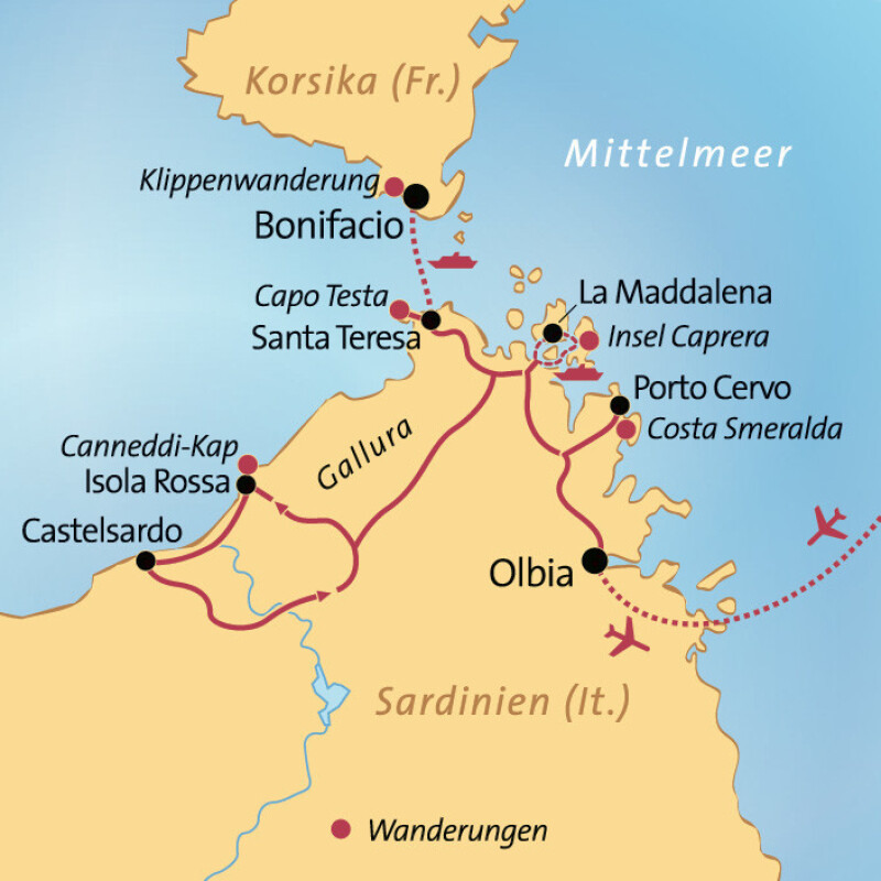 Busfahrt nach Santa Teresa di Gallura, Fährüberfahrt nach Korsika. Spaziergang durch Bonifacios Oberstadt mit romanischen und gotischen Kirchen. Anschließend Küstenwanderung mit spektakulären Ausblicken. Rückfahrt am späten Nachmittag.