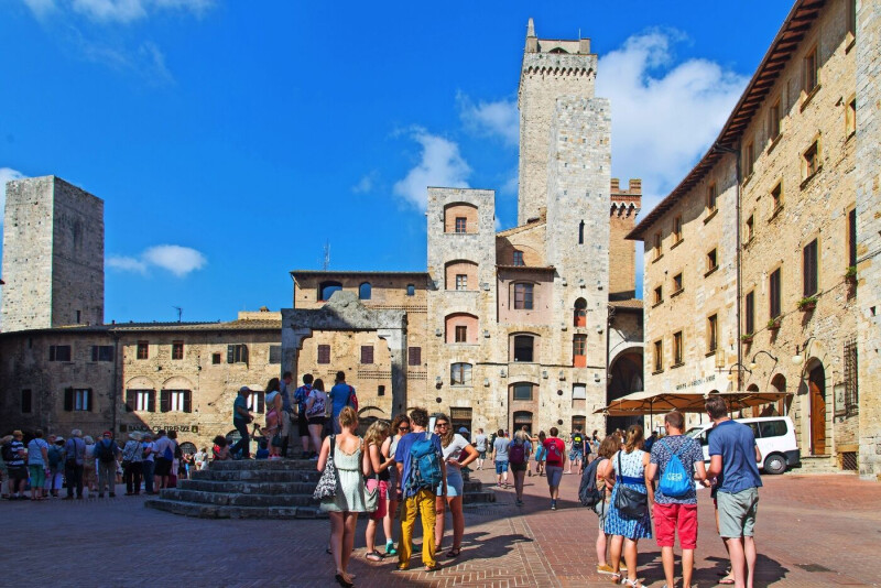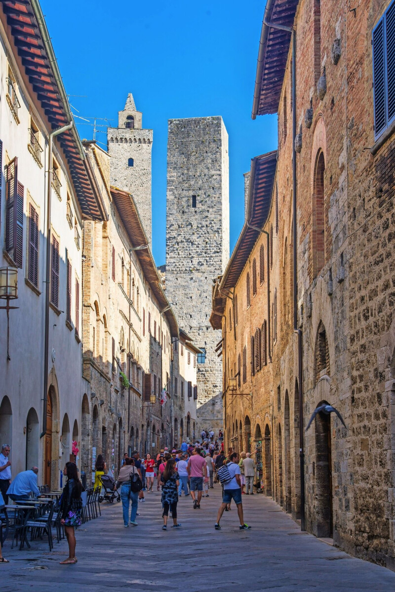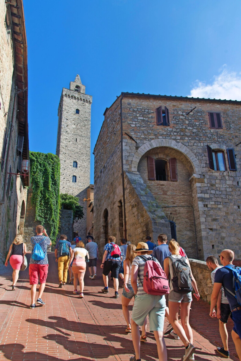 Der Ring von San Gimignano: Heute entdecken wir die malerische Hügellandschaft um San Gimignano. Unsere Wanderung führt über Schotterstraßen und Feldwege auf der ehemaligen Frankenstraße, auf der der Erzbischof von Canterbury 990 seine Pilgerreise nach Rom unternahm. Auf dem Weg nach San Gimignano streifen wir durch Vernaccia-Weinberge. Das mittelalterliche Städtchen erreichen wir beim südlichen Stadttor. Unser Wanderführer besichtigt mit uns den malerischen Altstadtkern. Wir genießen die Stadt der Geschlechtertürme und legen eine Entspannungspause in einer der besten italienischen Eisdielen, der Gelateria Dondoli, ein. Lassen Sie den Abend dann bei einem 4-Gang-Galadinner mit Live-Musik gemütlich ausklingen.