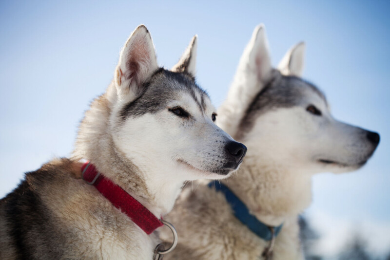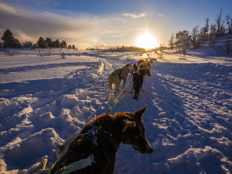 - Alaskan Huskies auf Schneeschlitten bei Sonnenuntergang in Geilo © doleesi - stock.adobe.com