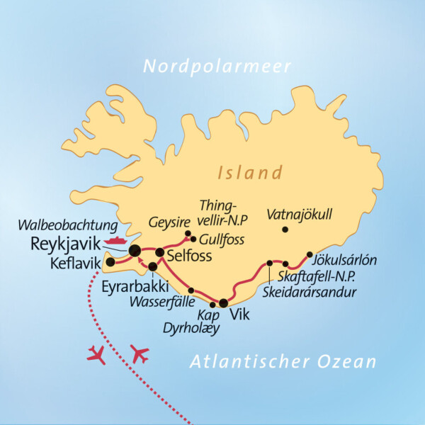 Flug von München nach Keflavík. Ankunft in Keflavík/Island und Begrüßung durch Ihren Reiseleiter. Transfer zur Unterkunft in Islands Hauptstadt Reykjavík. Der Abend steht Ihnen zur freien Verfügung.
